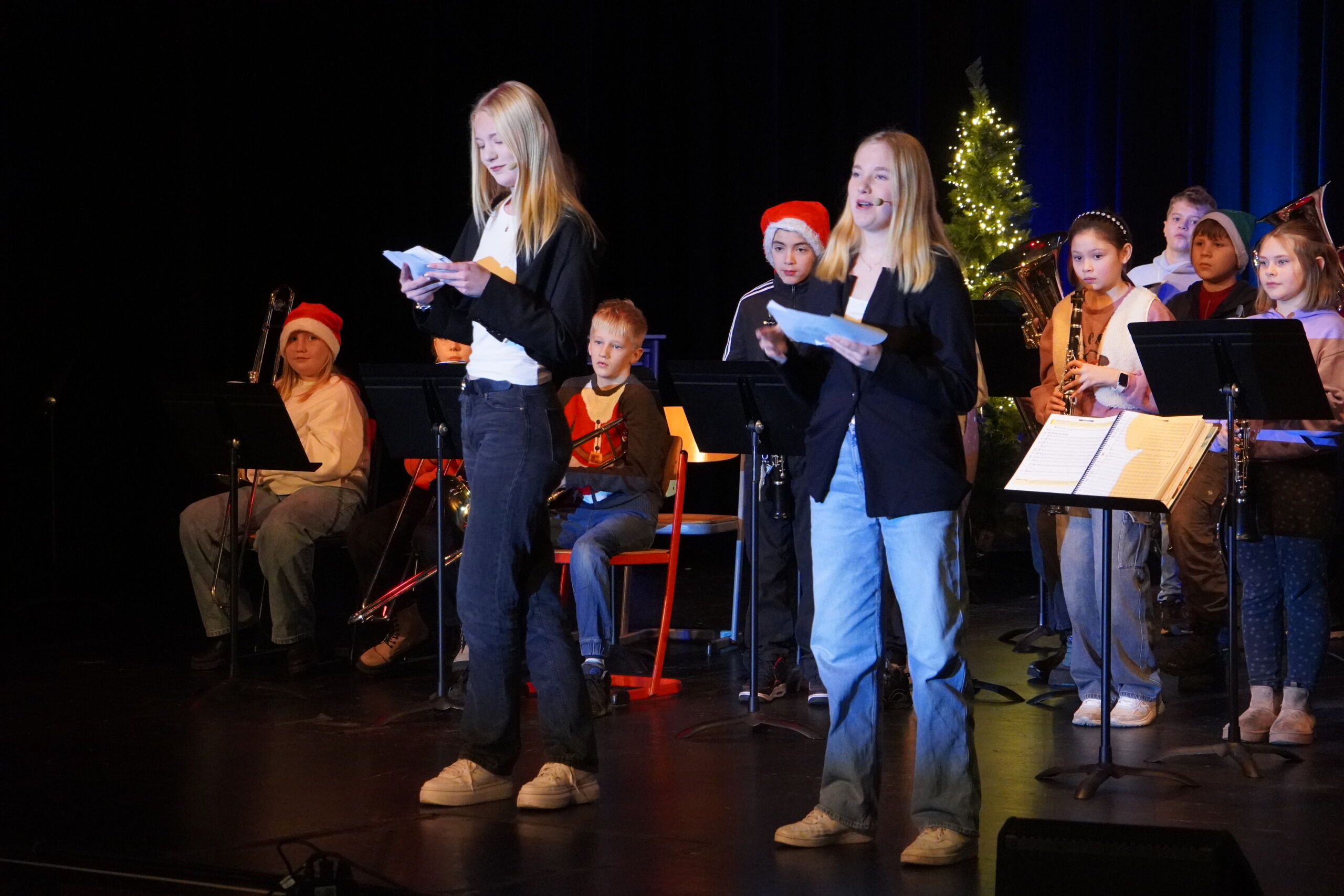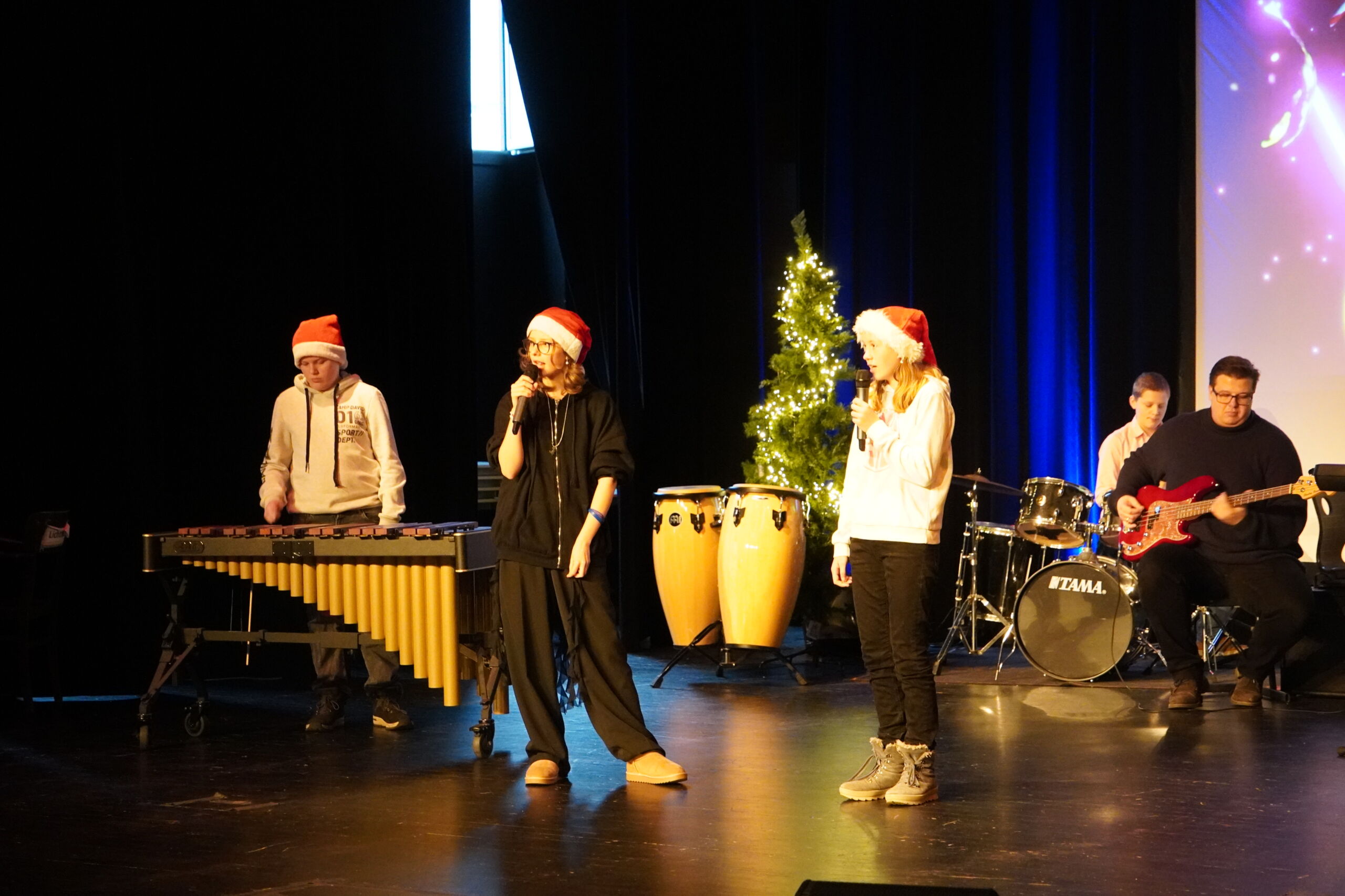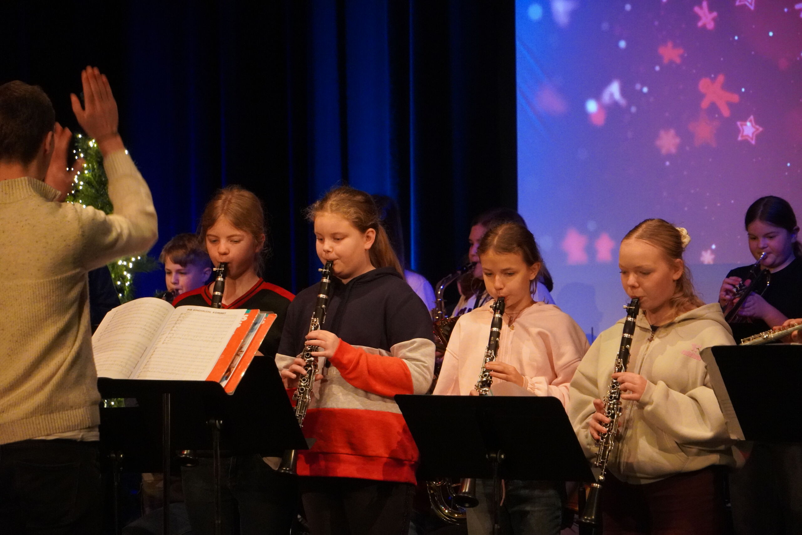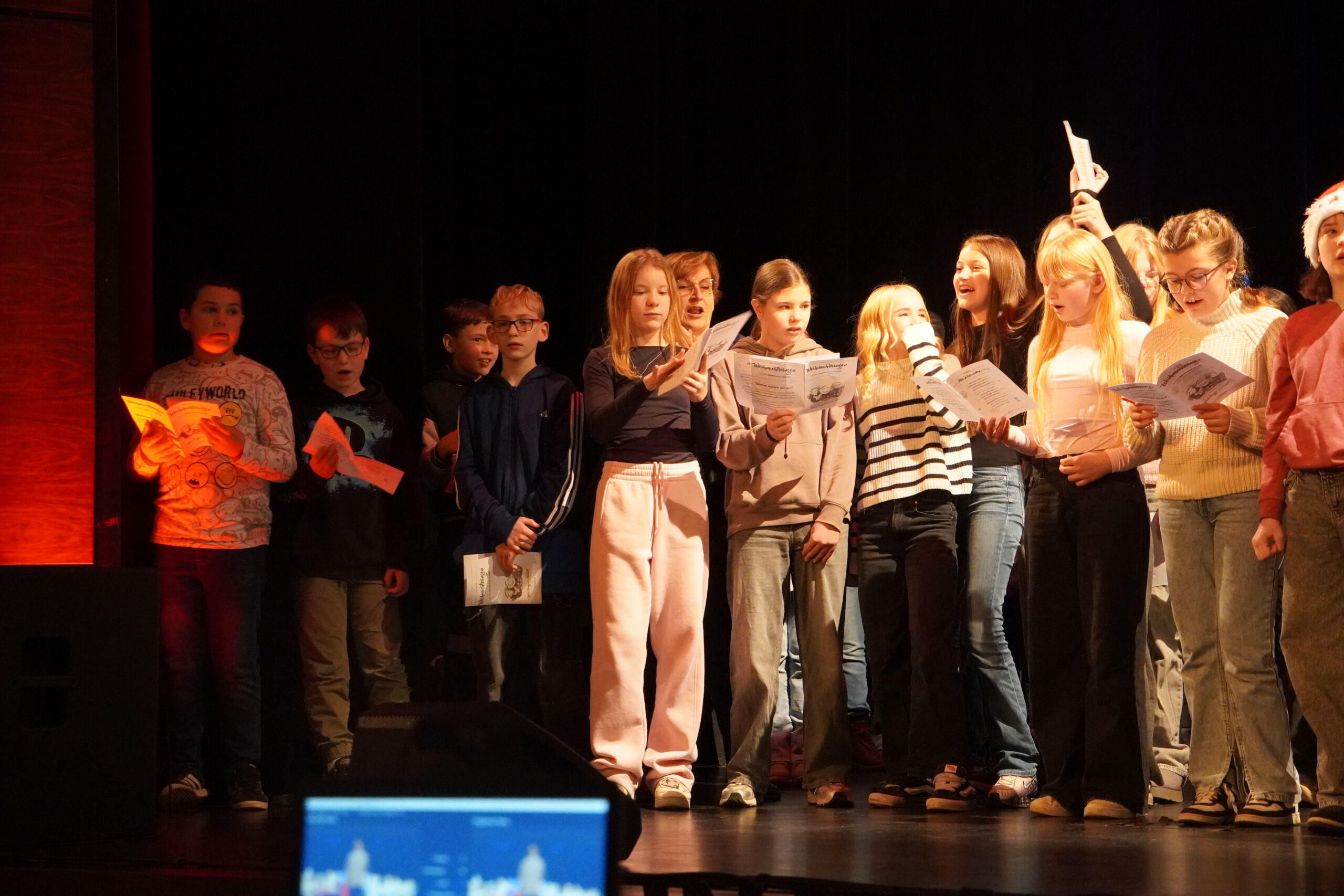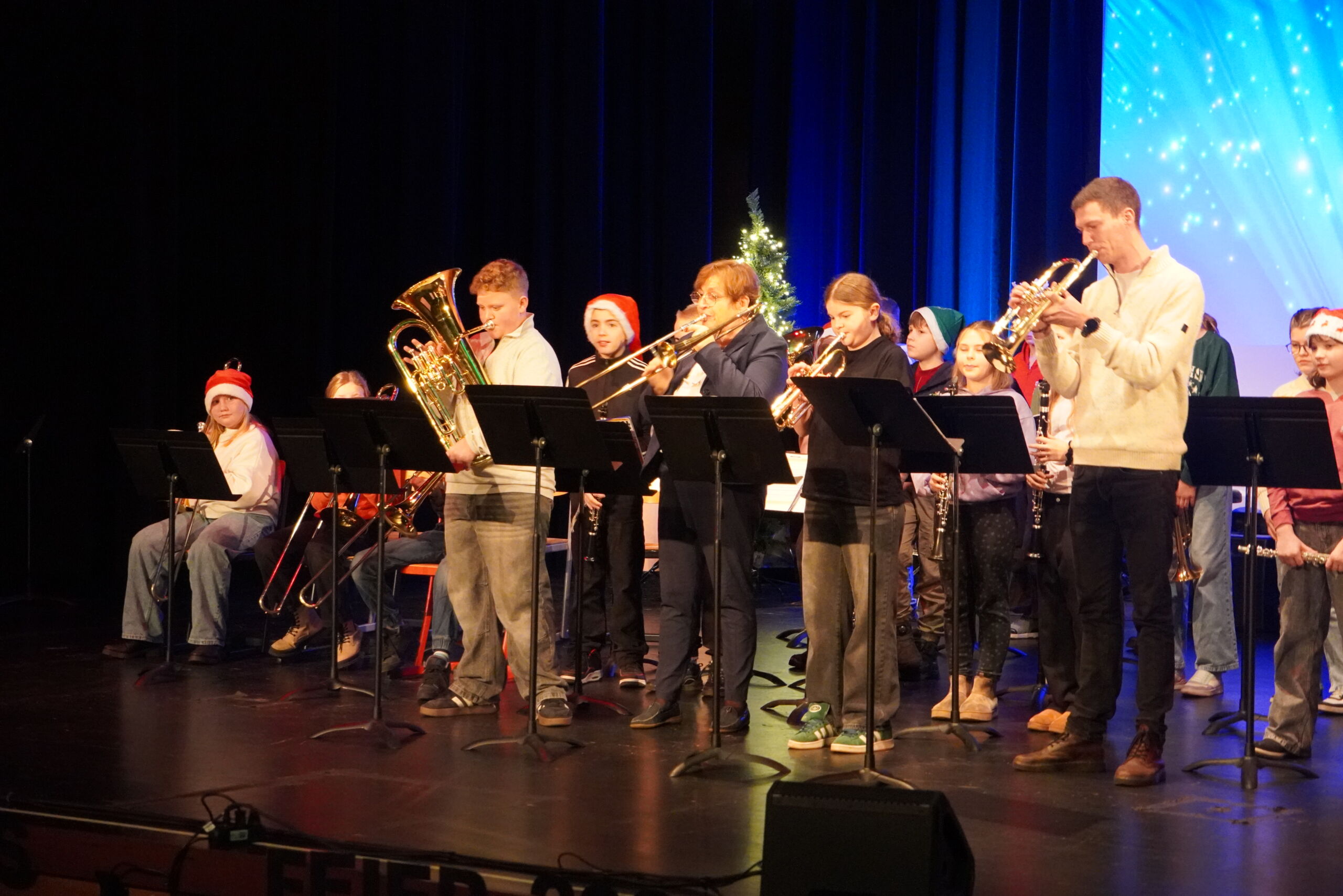 Die erste Feier begann stimmungsvoll mit dem musikalischen Intro „Tochter Zion“. Es folgten die Auftritte der Bläserklasse 5 mit „Morgen kommt der Weihnachtsmann“ und „Jingle Bells“ sowie der Bläserklasse 6 mit „Ihr Kinderlein kommet“, „Alle Jahre wieder“ und „Holly Jolly Christmas“. Nach einer Begrüßung durch Herrn Kaiser sorgten Tanz- und Wortbeiträge für Abwechslung, bevor das Video des Elternvereins krebskranker Kinder e. V. einen nachdenklichen Moment schuf. Achmed Shemo beeindruckte anschließend mit einem gefühlvollen Klavierstück.