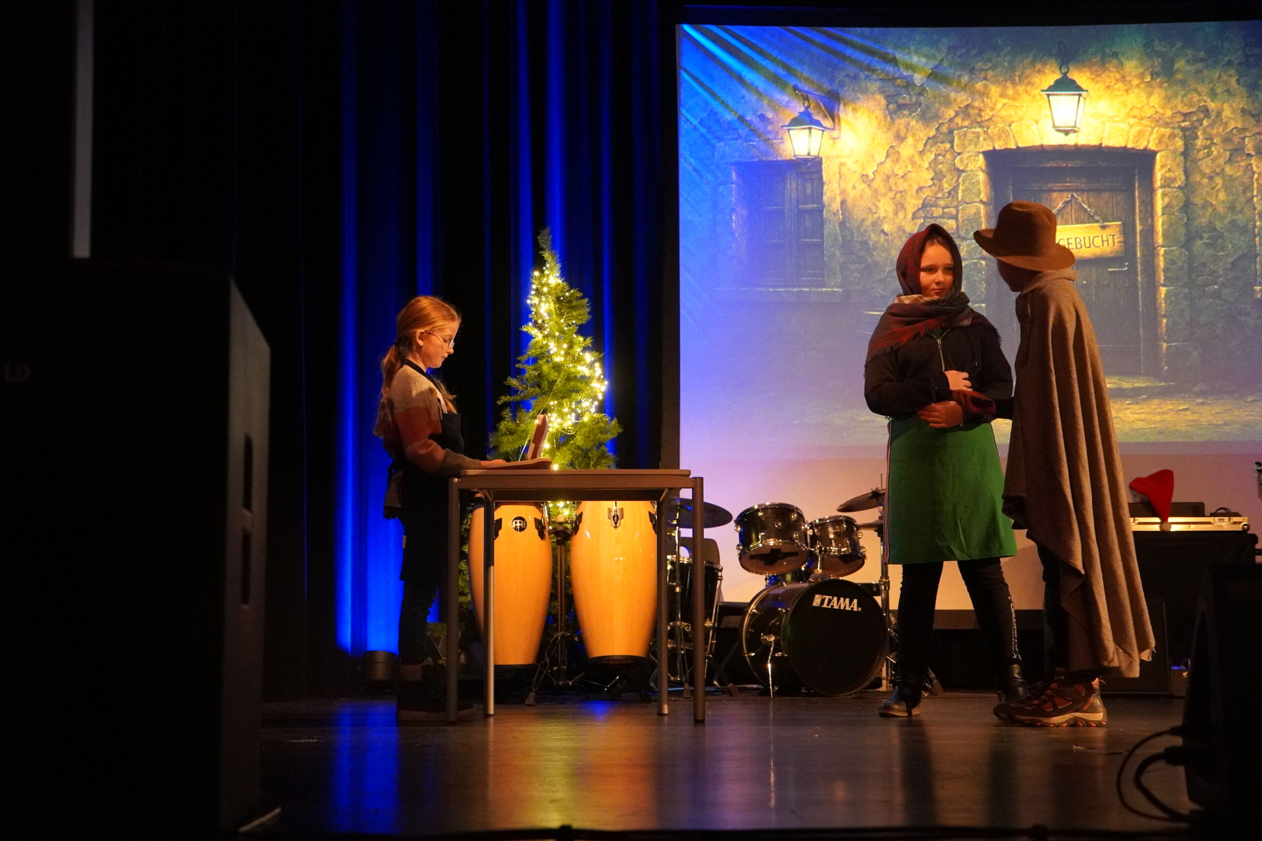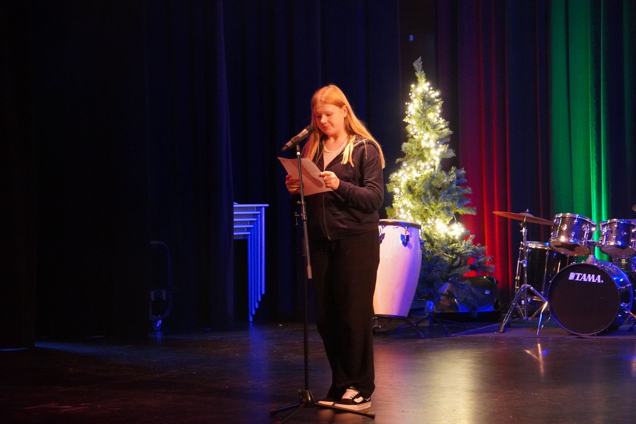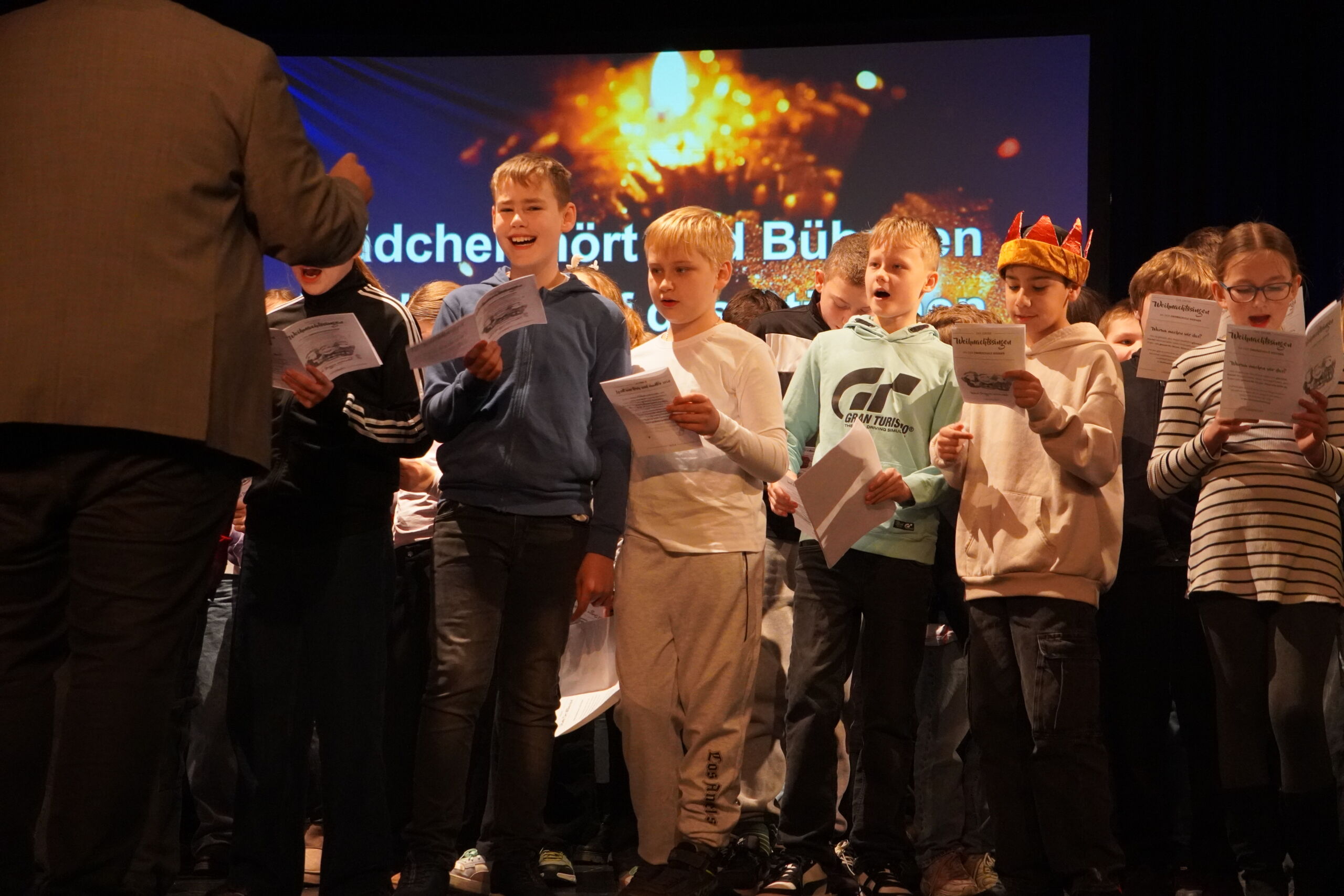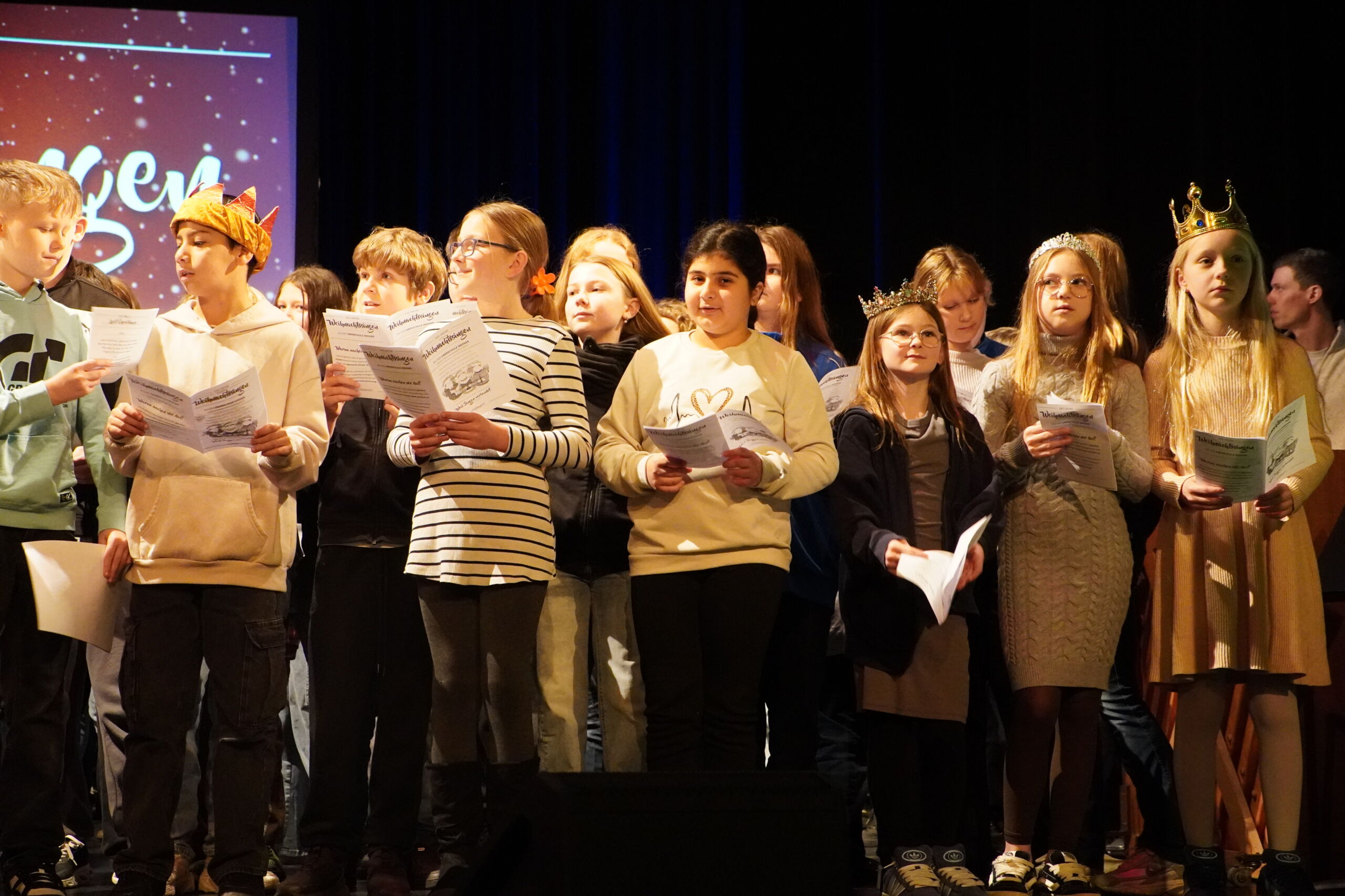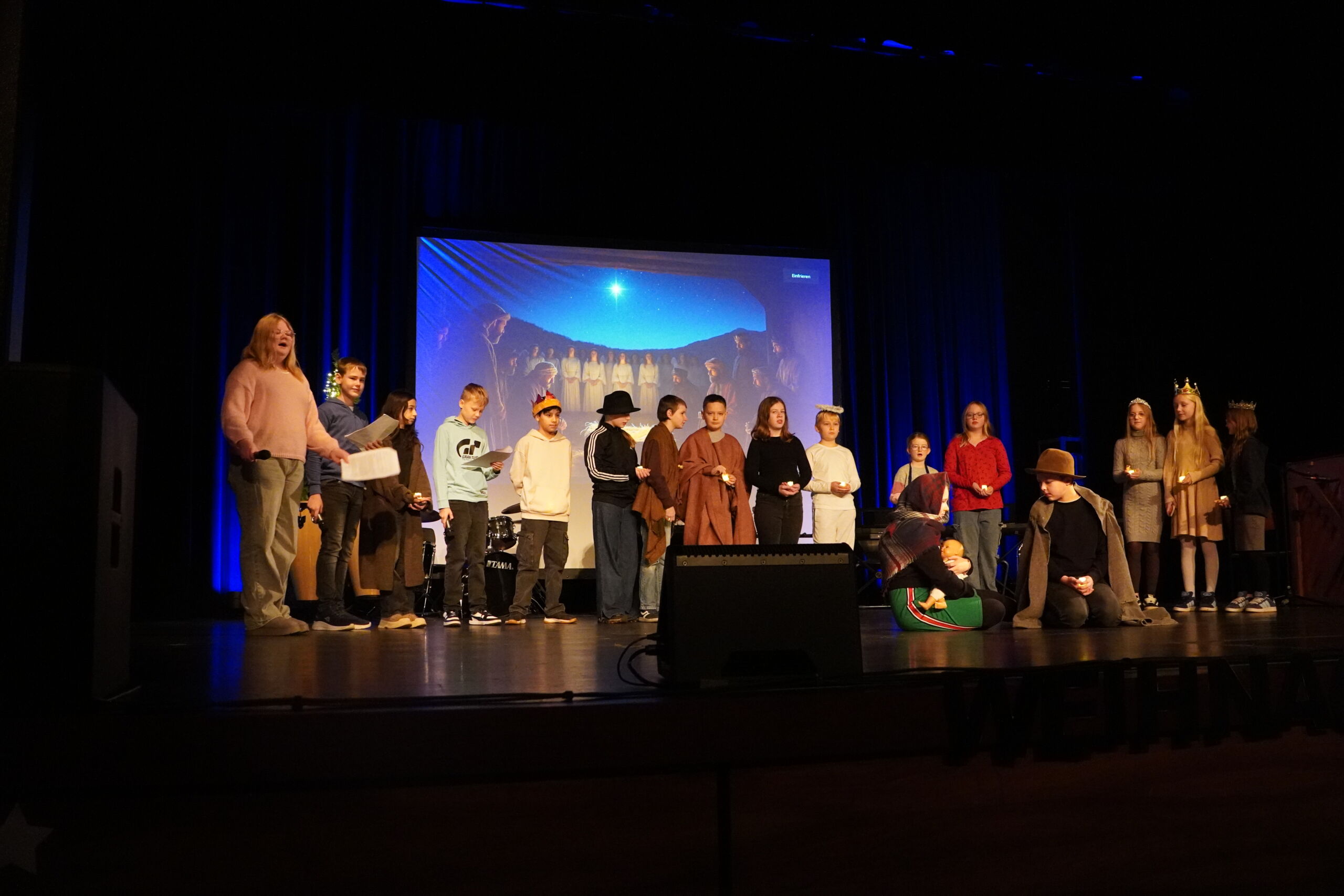 Ein besonderer Höhepunkt war das moderne Krippenspiel der Klasse 5d, das zunächst als Hörspiel aufgenommen und anschließend als Theaterstück auf der Bühne aufgeführt wurde. Für humorvolle Akzente sorgte das Gedicht „Die moderne Weihnachtsmaus“ der Klasse 5e, bevor der Musik-WPK E7/8 mit „Last Christmas“ einen modernen Schlusspunkt setzte. Den Abschluss bildete das gemeinsame Weihnachtssingen des gesamten 5. Jahrgangs.
