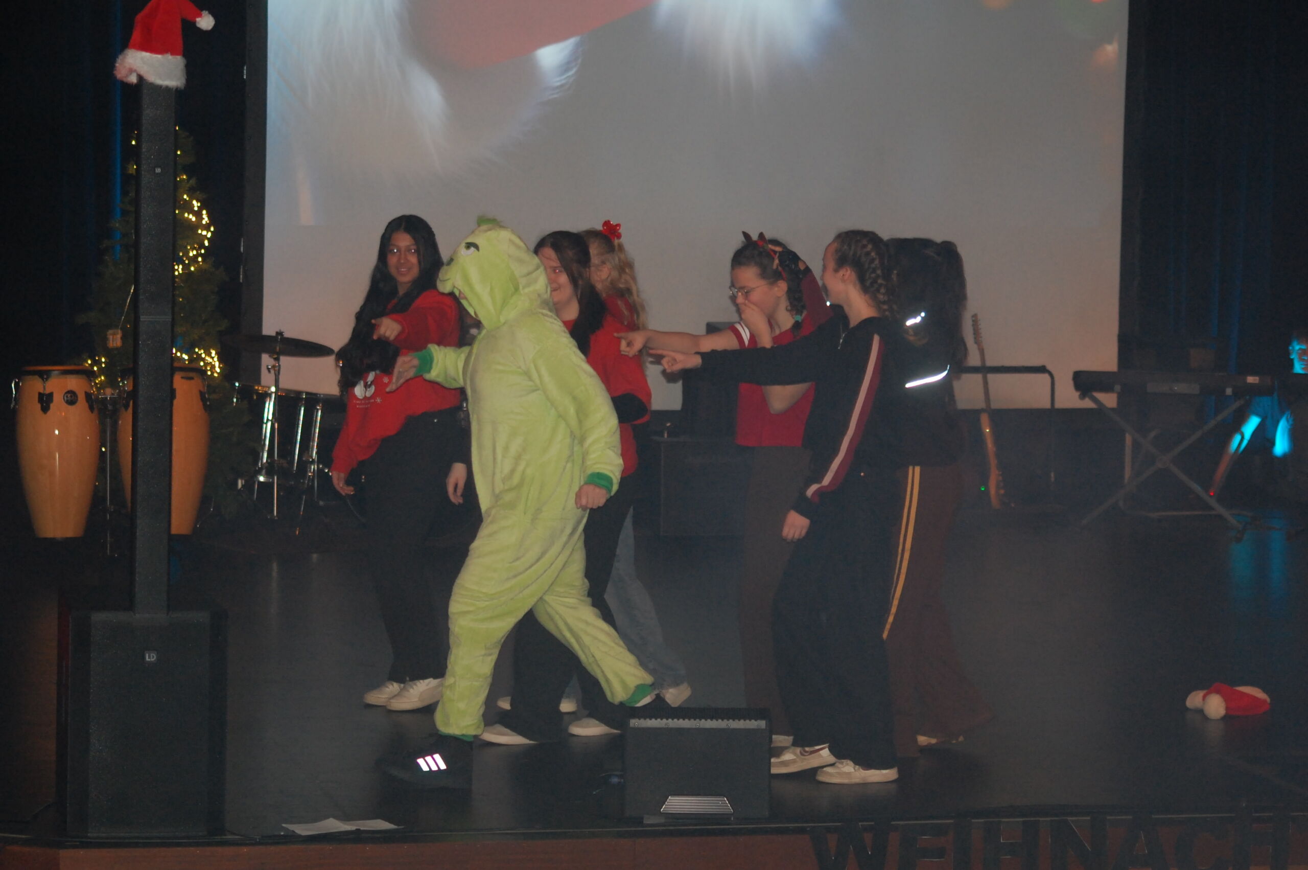 Die zweite Veranstaltung begann mit dem Intro „Let it snow“. Das Schulorchester spielte „Can you feel the love tonight?“ und „Rudolph“. Es folgten ein Tanz der Klasse G8a zu „You’re a mean one, Mr. Grinch“ sowie ein Sketch des WPK Niederländisch 8.