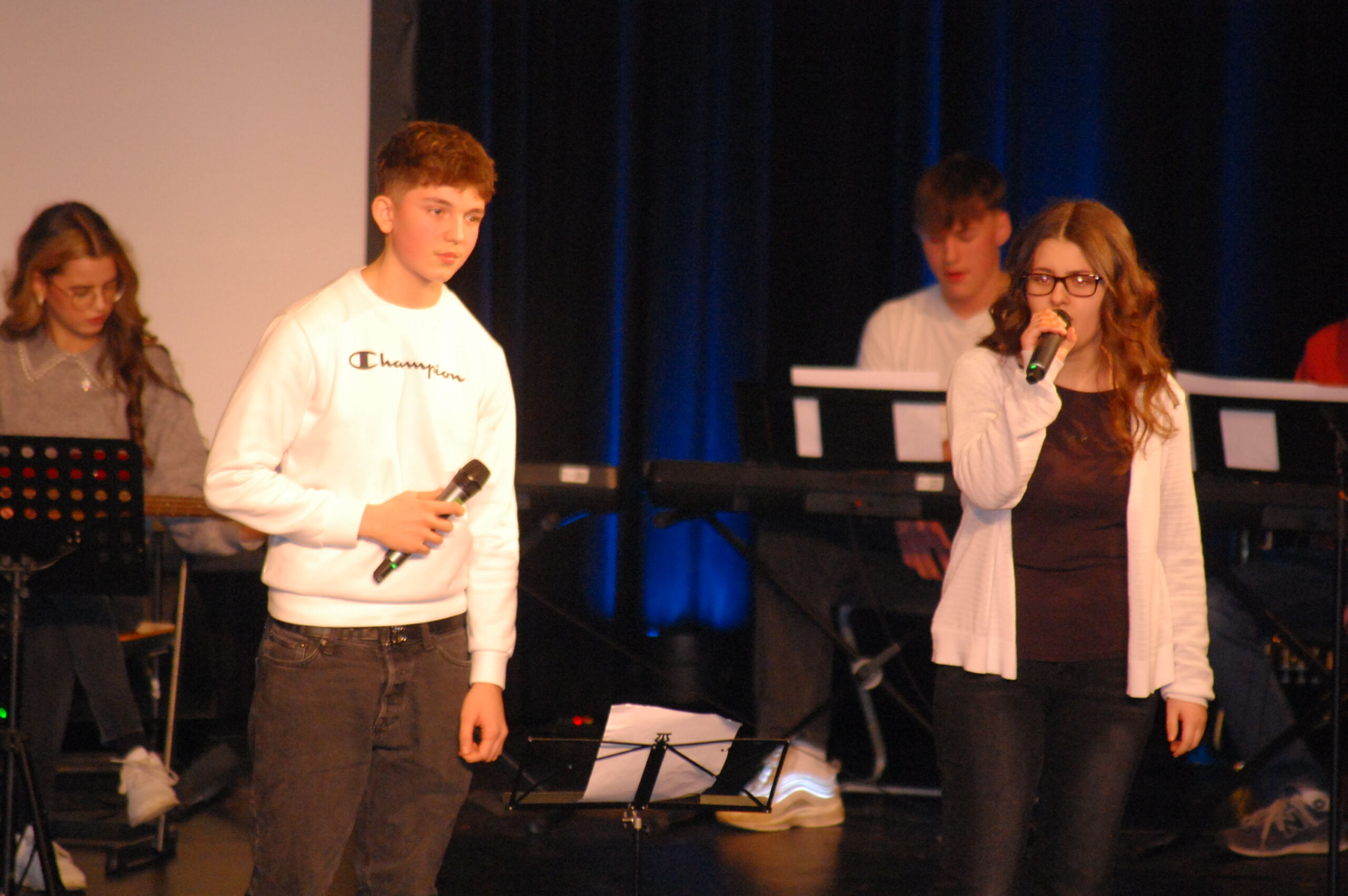 Musikalisch überzeugte Arian Grimberg mit „Where did you sleep last night“. Der Musik-WPK E9 präsentierte „Nur ein Wort“, bevor Lea, Mia, Feemke und Herr Zimmermann gemeinsam „Pianoman“ aufführten – besonders Leas Mundharmonikaspiel begeisterte das Publikum. Der Musik-WPK E10 berührte mit „See You Again“, bevor der Tanz des WPK Niederländisch 10 für große Stimmung im Publikum und einen gelungenen Abschluss sorgte.